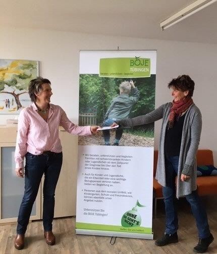Birgit Block konnte in ihrem Projekt "Herzflügel" über den Verkauf von „Herzensschränkchen“ einen Betrag von 500 Euro zusammentragen. Herzensschränkchen können ein kleines dekoratives Schmuckstück für das Zuhause sein – und noch viel mehr: sie laden ein, das Wohlbefinden zu stärken, eigene Themen zu bearbeiten oder Wünsche auf den Weg zu bringen. Zur Übergabe ihrer Spende zu Gunsten der BOJE war Birgit Block am 14. Oktober in die Räume der Hospizdienste nach Tübingen gekommen. „Mit sehr viel Herzenswärme und Empathie geht Frau Block in Begegnung mit Menschen, was ihre Arbeit gemeinsam hat mit der hospizlichen Tätigkeit“, so Hospiz-Geschäftsführerin Constanze Scholzgart, „für den schönen Austausch über unsere Tätigkeiten in einem besonders schönen Gespräch und für die Spende sagen wir von Herzen danke!“.